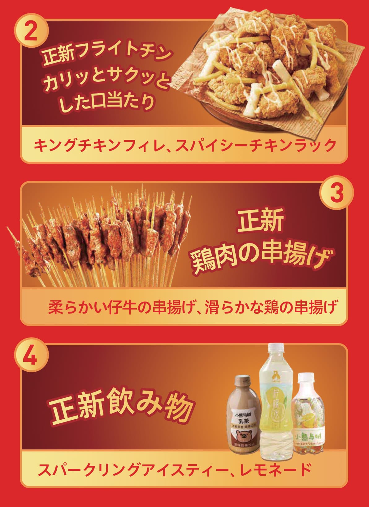 本場中国そのままの大判フライドチキンや串焼き、各種バーガーを提供し、現地の雰囲気と味を楽しめます。